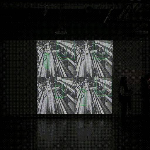 A fine-tuned StableDiffusion model trained on Insecam screengrabs generates CCTV imagery based on bodies detected in the space.